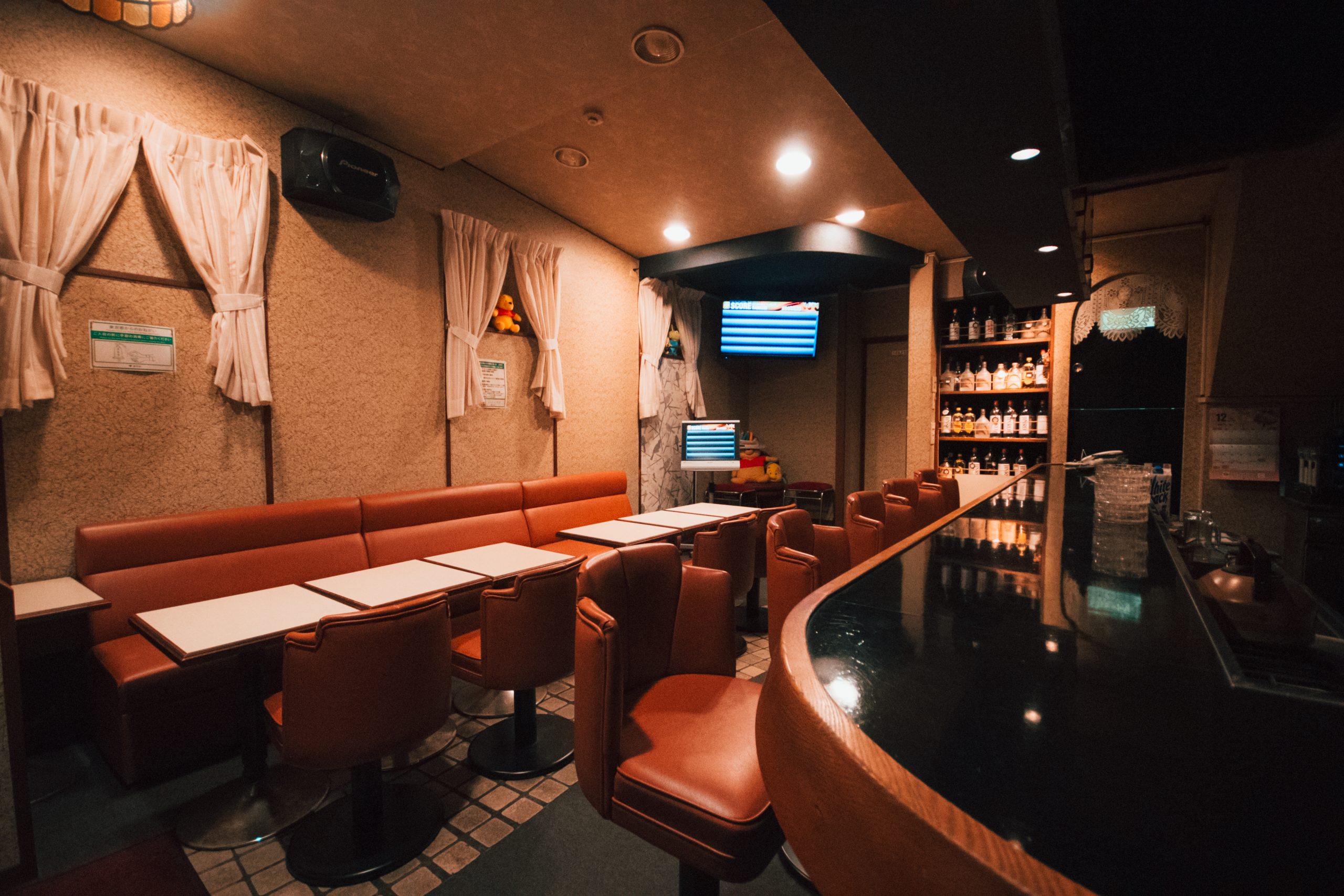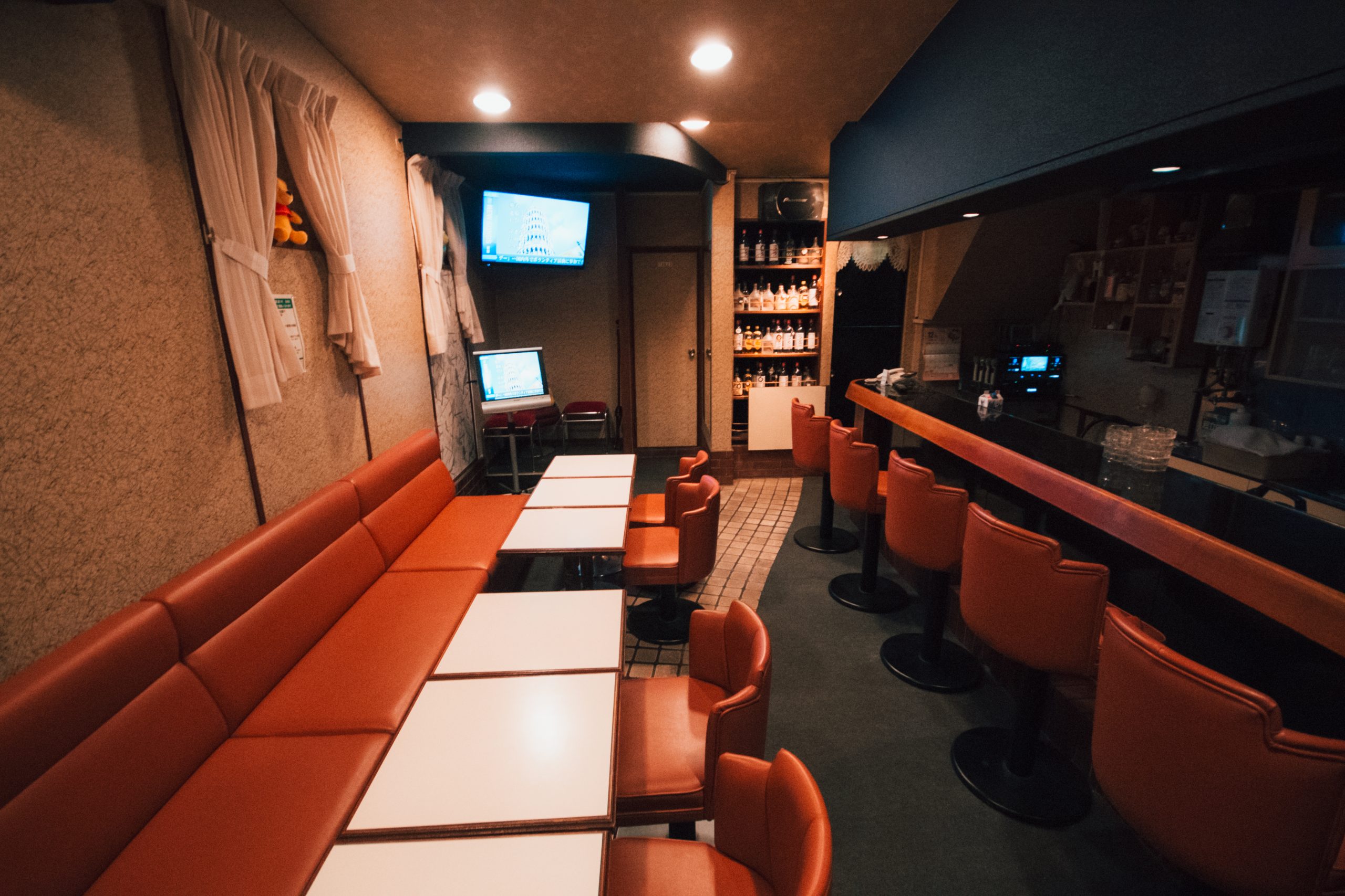 ボトルキープは3,000円〜と良心的な価格設定。カウンター席・テーブル席を備え、カラオケ(1曲200円)も楽しめます。