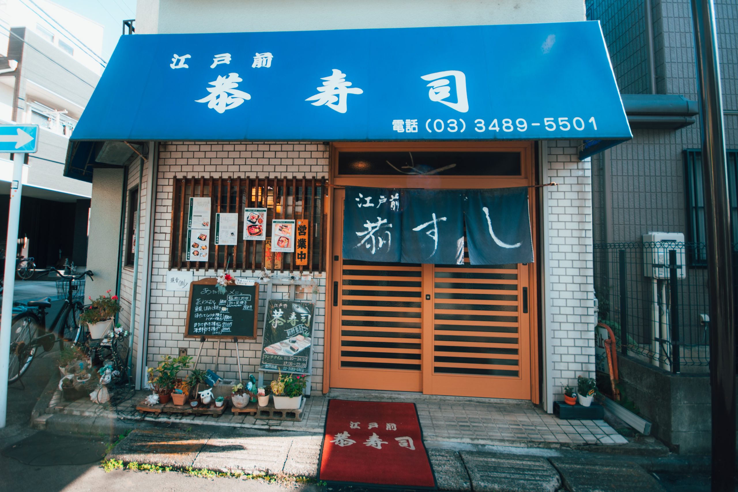 メイン通り同士が交わる場所にあり、ブルー地に白文字の「江戸前 恭寿司」の看板が、とても爽やかで印象的です。